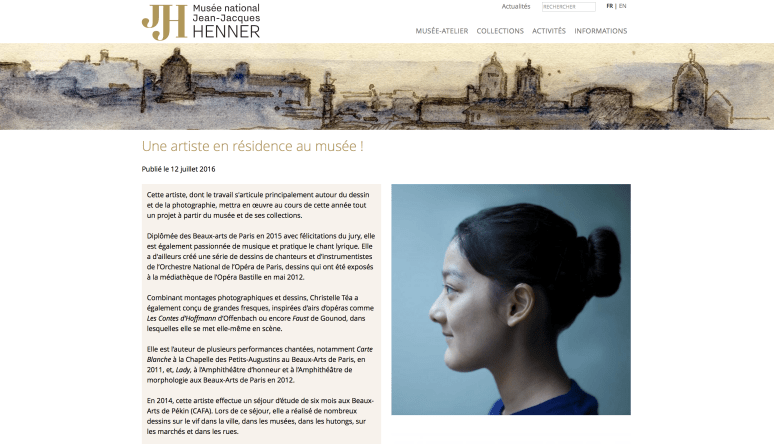 Résidence d’artiste, de septembre 2016 à juin 2017, au Musée Jean-Jacques Henner (43, avenue de Villiers, 75017 Paris). http://www.musee-henner.fr