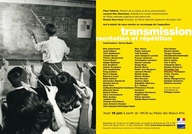 Exposition collective Transmission, récréation et répétition (commissaire : Sarina Basta), au Palais des Beaux-Arts, Paris.
