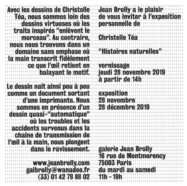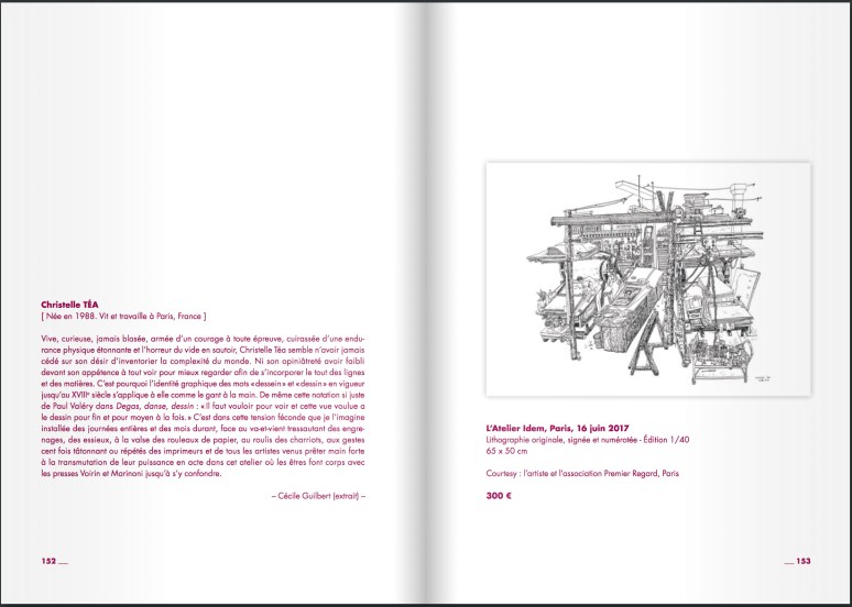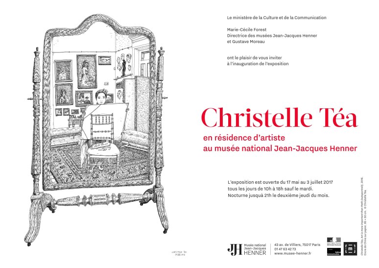 Christelle Téa (1988) a exposé dans différents musées et institutions, dans de nombreux salons et foires parisiens, ainsi que dans des galeries d’art privées. Elle se consacre essentiellement à dessiner des portraits sur le vif et des vues d’intérieur.