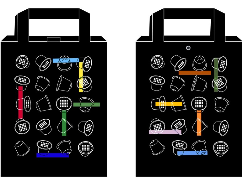 Exposition collective Nespresso Sac d’habillage de recyclage à la Boutique Nespresso Bonaparte à Paris, Marseille, Montpellier, Nantes et Bordeaux.