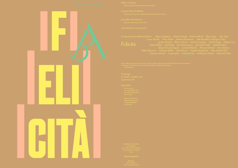 Exposition Felicità, exposition des diplômés félicités des Beaux-Arts de Paris, au Palais des Beaux-Arts, Paris. Commissariat : Alexia Fabre, Jean-Luc Blanc, Jean-Charles Massera et Morgane Tschiember.