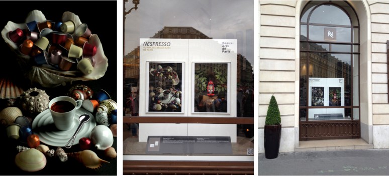 Christelle TEA, Coque et Capsules, Oeuvre photographique, 2014. © Christelle Tea ; photos de droite prise de vue © par Stefano Marchionini à la boutique Nespresso d’Opéra