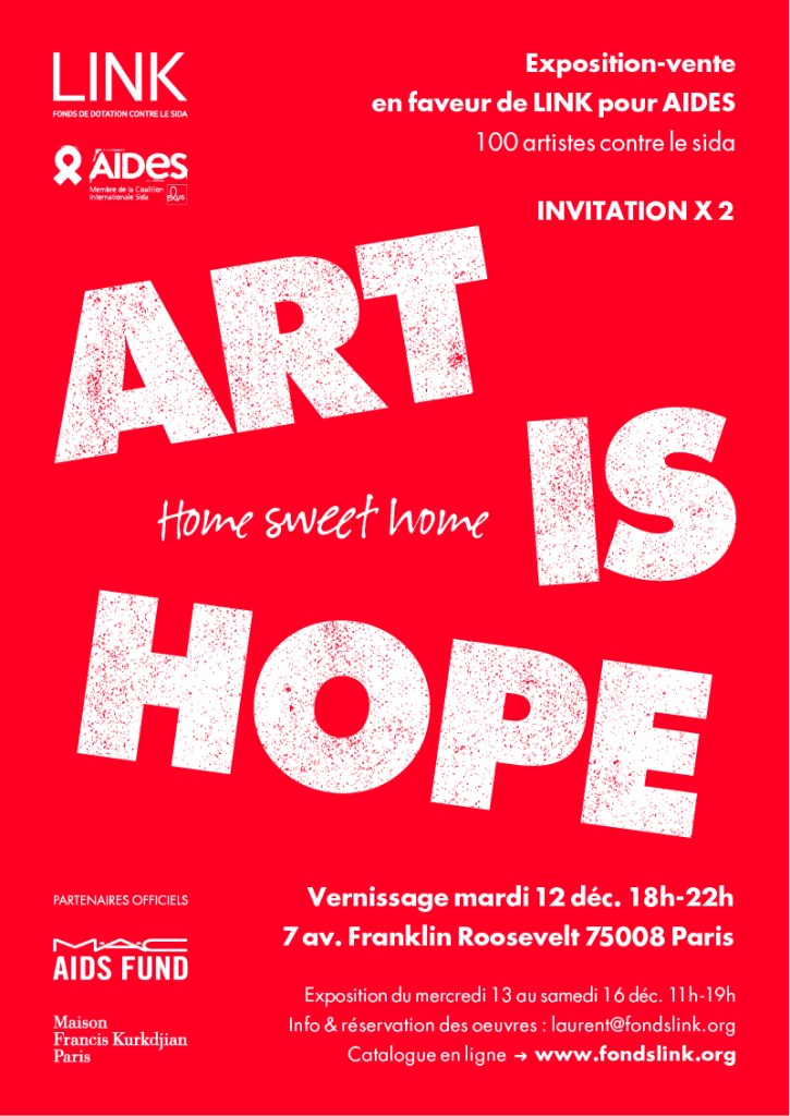 Exposition collective Art is Hope, avec l’Association Premier Regard, don d’une lithographie imprimée par Idem Paris, qui sera mis en vente pour Link Fonds de Dotation contre le Sida. Catalogue en ligne cliquez ici (page 152 – 153).