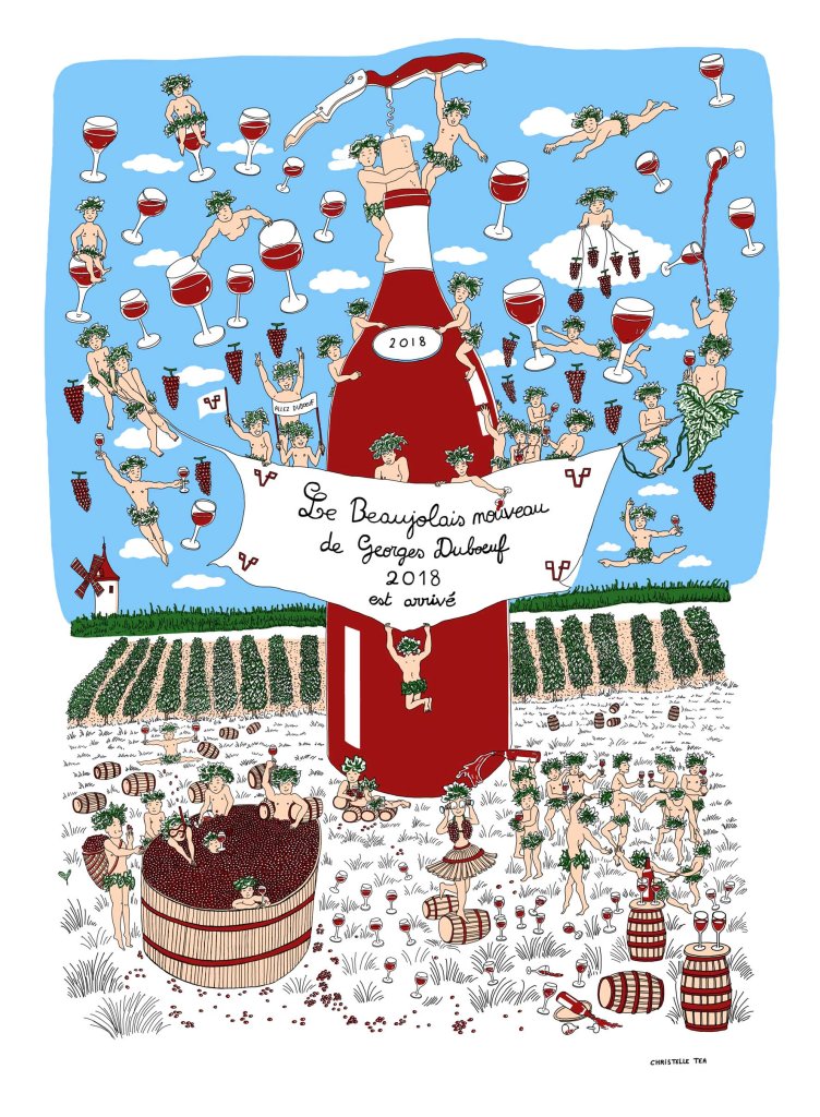 Création de l’affiche Le Beaujolais nouveau de Georges Duboeuf 2018 est arrivé! en lithographie chez Idem Paris et en offset.