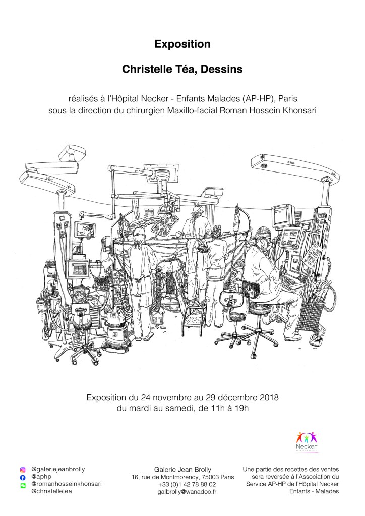 Exposition Christelle Téa, dessins réalisés dans le Service de Chirurgie Maxillofaciale et Chirurgie Plastique de L’Hôpital Necker – Enfants Malades (AP-HP), sous la coordination du Dr Roman Hossein Khonsari, Galerie Jean Brolly (16, rue de Montmorency, 75003 Paris), du 24 novembre au 29 décembre.